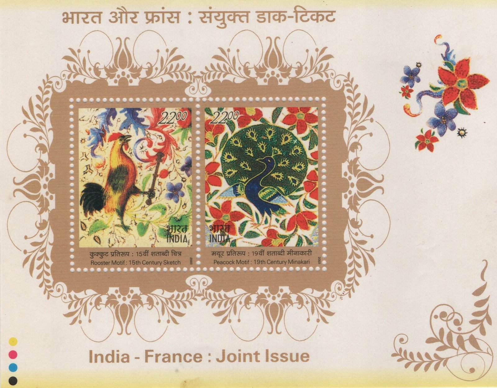 Celebrate the artistry and cultural exchange between India and France with this exquisite joint issue postage stamp. This remarkable collector’s item features two stunning stamp designs, each a testament to the rich heritage of its respective country. The first stamp showcases the ‘Rooster Motif: 15th Century Sketch’, a vibrant and historically significant artwork from India. The intricate details of the rooster, set against a backdrop of delicate floral patterns, reflect the artistic traditions of the 15th century. The second stamp presents the ‘Peacock Motif: 19th Century Minakari’, a masterpiece of Indian craftsmanship. The peacock, a symbol of grace and beauty, is depicted in the traditional Minakari style, a technique of enameling with vibrant colors that brings the peacock to life. This stamp set is a beautiful representation of Indo-French cooperation, blending heritage with cultural exchange, making it a great addition to any philatelic collection. Its a limited-edition joint issue, perfect for collectors and enthusiasts of Indian and French art and history. The stamps feature beautiful artwork and unique designs that will bring a touch of history and heritage to your collection. This special issue is a must-have for those who appreciate philately, art, and the cultural connection between India and France. This exceptional piece showcases the best of Indian and French art, making it a must-have for collectors and enthusiasts alike. Get yours today!
