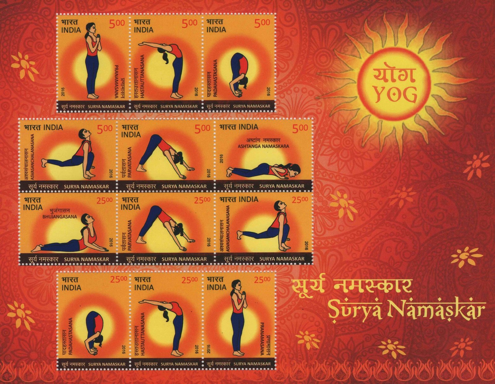 Immerse yourself in the world of philately and the ancient art of yoga with this exquisite collection of Indian postage stamps dedicated to Surya Namaskar, the Sun Salutation. Issued by India Post in 2016, this unique set captures the essence of well-being and spiritual harmony through a series of beautifully illustrated yoga asanas. Each stamp meticulously depicts a specific pose from the 12-step Surya Namaskar sequence, offering a visual journey through this revered practice. This philatelic treasure includes stamps with denominations of 500 Paise (INR 5) and 2500 Paise (INR 25), making it a valuable addition for both seasoned philatelists and budding collectors. The detailed illustrations showcase key postures like Pranamasana (Prayer Pose), Hasta Uttanasana (Raised Arms Pose), Padahastasana (Hand to Foot Pose), Ashwa Sanchalanasana (Equestrian Pose), Parvatasana (Mountain Pose), Ashtanga Namaskara (Eight-Limbed Salutation), and Bhujangasana (Cobra Pose). These stamps not only serve as a testament to India’s rich cultural heritage but also promote the global adoption of yoga, recognized for its immense physical and mental benefits. Perfect for display, gifting, or adding to your thematic stamp collection, these Yoga Surya Namaskar stamps are a celebration of health, peace, and India’s contribution to global wellness. Whether you are a yoga enthusiast seeking inspiration or a stamp collector looking for unique and meaningful additions, this collection promises to be a cherished possession. Discover the intricate artistry and cultural significance embedded in each stamp, representing a blend of tradition and modern philatelic appeal. Enhance your collection with this vibrant and historically significant set, celebrating the timeless practice of yoga.