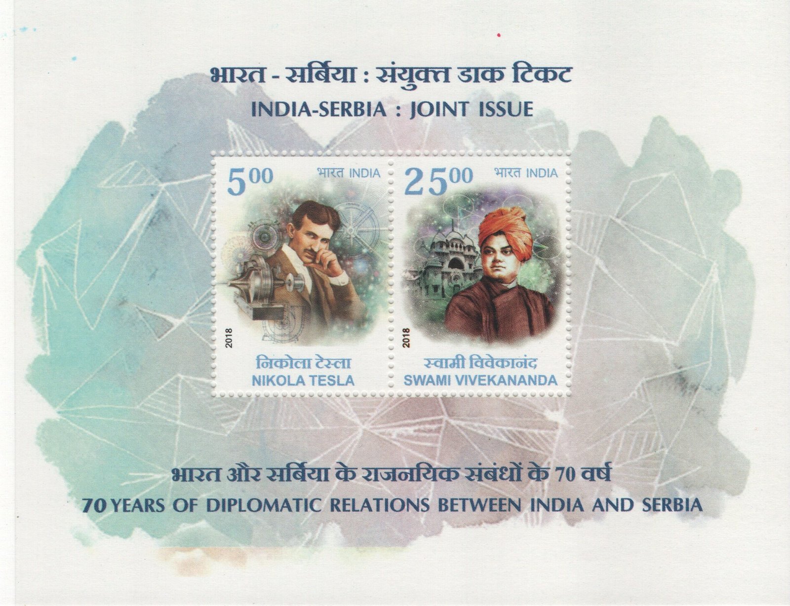 Celebrate the profound bond between India and Serbia with this exceptional joint issue postage stamp sheet, released in 2018 to commemorate 70 years of diplomatic relations. This unique philatelic collectible features two distinct stamps, honoring legendary figures who have left an indelible mark on human history and thought. One stamp pays tribute to Nikola Tesla, the brilliant Serbian-American inventor, electrical engineer, mechanical engineer, and futurist best known for his contributions to the design of the modern alternating current (AC) electricity supply system. His groundbreaking work revolutionized the way electricity is generated, transmitted, and utilized, laying the foundation for many technological advancements we enjoy today. This stamp captures his pioneering spirit and immense intellect. The second stamp is dedicated to Swami Vivekananda, the revered Indian Hindu monk, a chief disciple of the 19th-century Indian mystic Ramakrishna. Vivekananda played a pivotal role in introducing Vedanta and Yoga to the Western world and is credited with raising interfaith awareness, bringing Hinduism to the status of a major world religion during the late 19th century. His teachings emphasized universal brotherhood, self-realization, and social service, inspiring millions across the globe. This stamp beautifully portrays his spiritual wisdom and enduring legacy. This joint issue is not merely a set of stamps but a tangible representation of cultural exchange, shared values, and historical ties between the two nations. It highlights the mutual respect and recognition of impactful personalities from both India and Serbia. Ideal for philatelists, history enthusiasts, and collectors of commemorative items, this sheet serves as a significant piece of history, encapsulating the artistic design and historical importance of a special diplomatic milestone. Add this rare and meaningful collectible to your portfolio and own a piece of this unique bilateral commemoration. This philatelic marvel is a must-have for anyone interested in international diplomacy, science, spirituality, and collecting rare stamps.