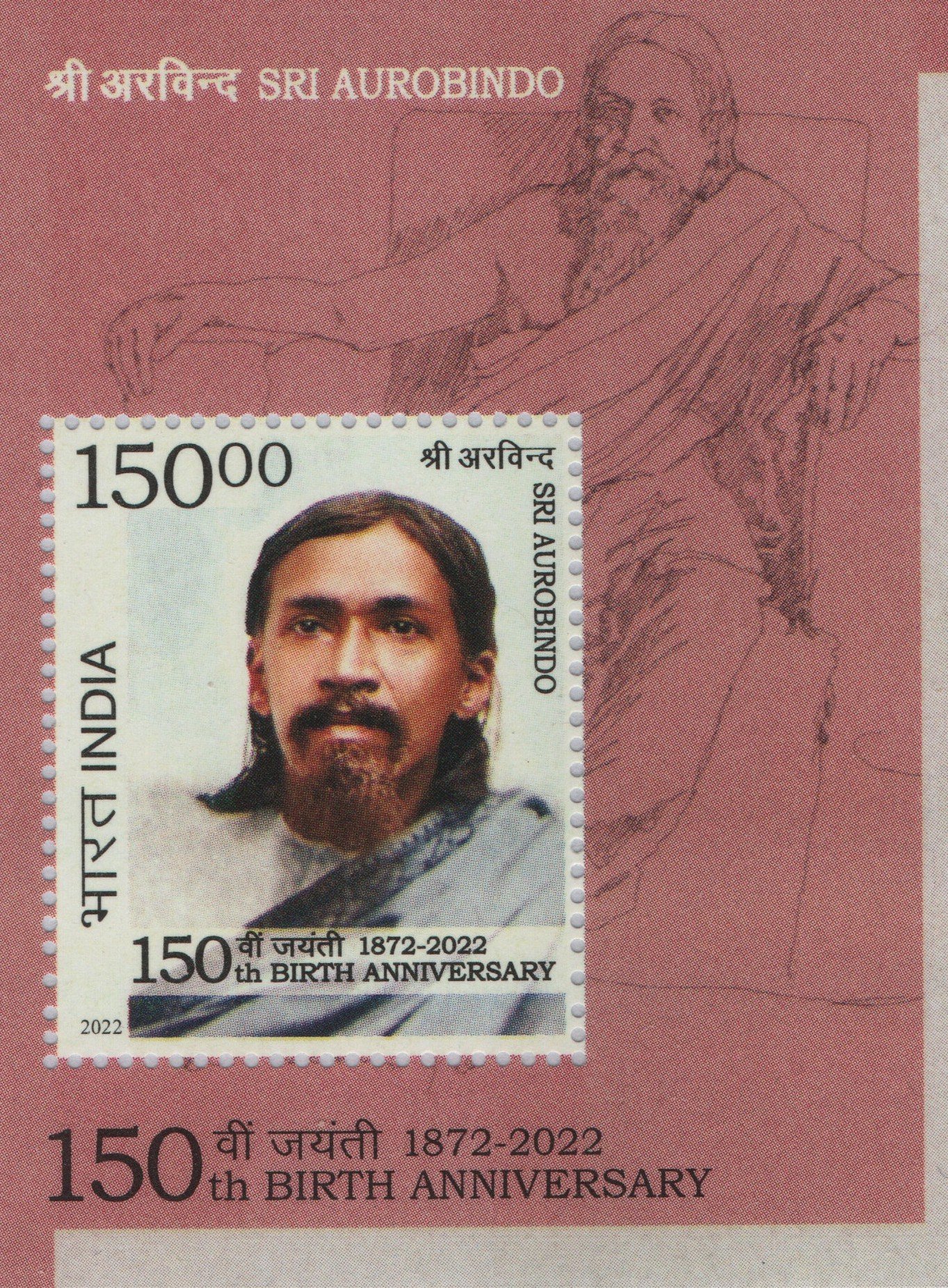This philatelic gem commemorates a significant milestone, marking 150 years since the birth of one of India’s most influential spiritual leaders (1872-2022). It serves as a beautiful tribute to his enduring legacy, his vision of spiritual evolution, and his contributions to India’s independence movement. The stamp’s denomination of 150.00 is clearly marked, indicating its face value.