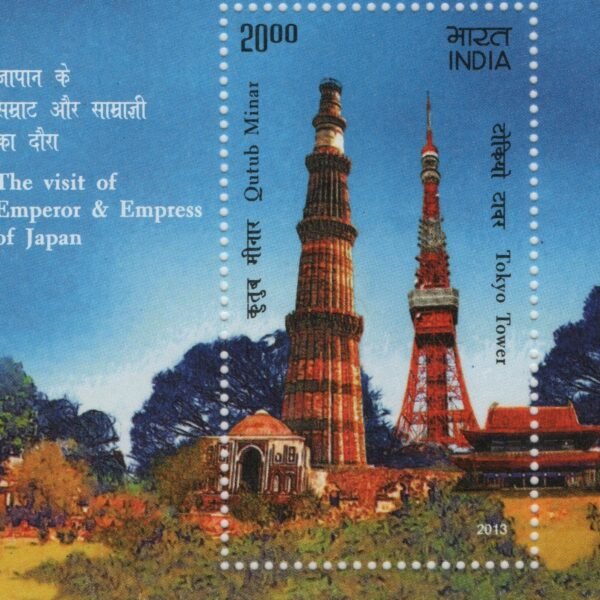 Indian Miniature Sheet – Emperor & Empress of Japan Visit, Qutub Minar & Tokyo Tower Stamp ( 5th Dec 2013)